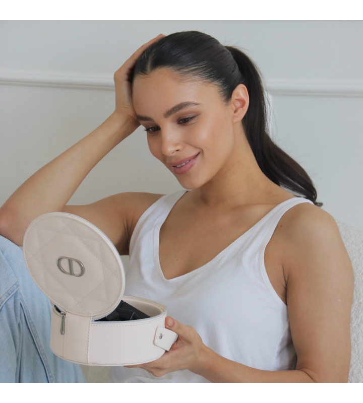 Нежный бежевый оттенок, лаконичная круглая форма и утонченный дизайн косметички с узором «каннаж» воплощают идеальный союз современности и наследия Дома Dior.