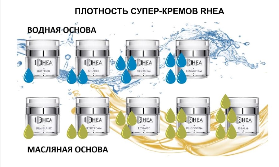 Формула супер-кремов RHEA содержит высокую концентрацию активных ингредиентов, проникновение которых усилено уникальным проводником – «жидкой иглой» (запатентованный транспортный комплекс TRANSCUTOL). Также особенностью супер-кремов RHEA является то, что каждый из них, независимо от направления действия, содержит комплекс различных противовозрастных ингредиентов.