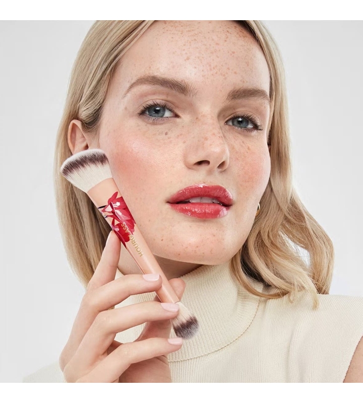 Более широкая скошенная сторона кисти подходит для идеальной растушевки румян, а более узкая сторона обеспечивает безупречное растушевывание хайлайтера.